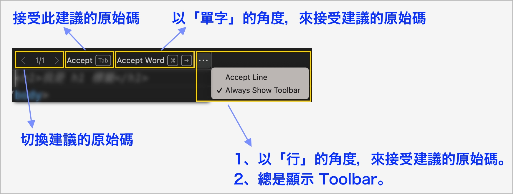 註:當 Copilot 產生建議的原始碼之後,可透過 Tab 鍵,同意採納原始碼。若不採納,可不用理會,或按 ESC 鍵。