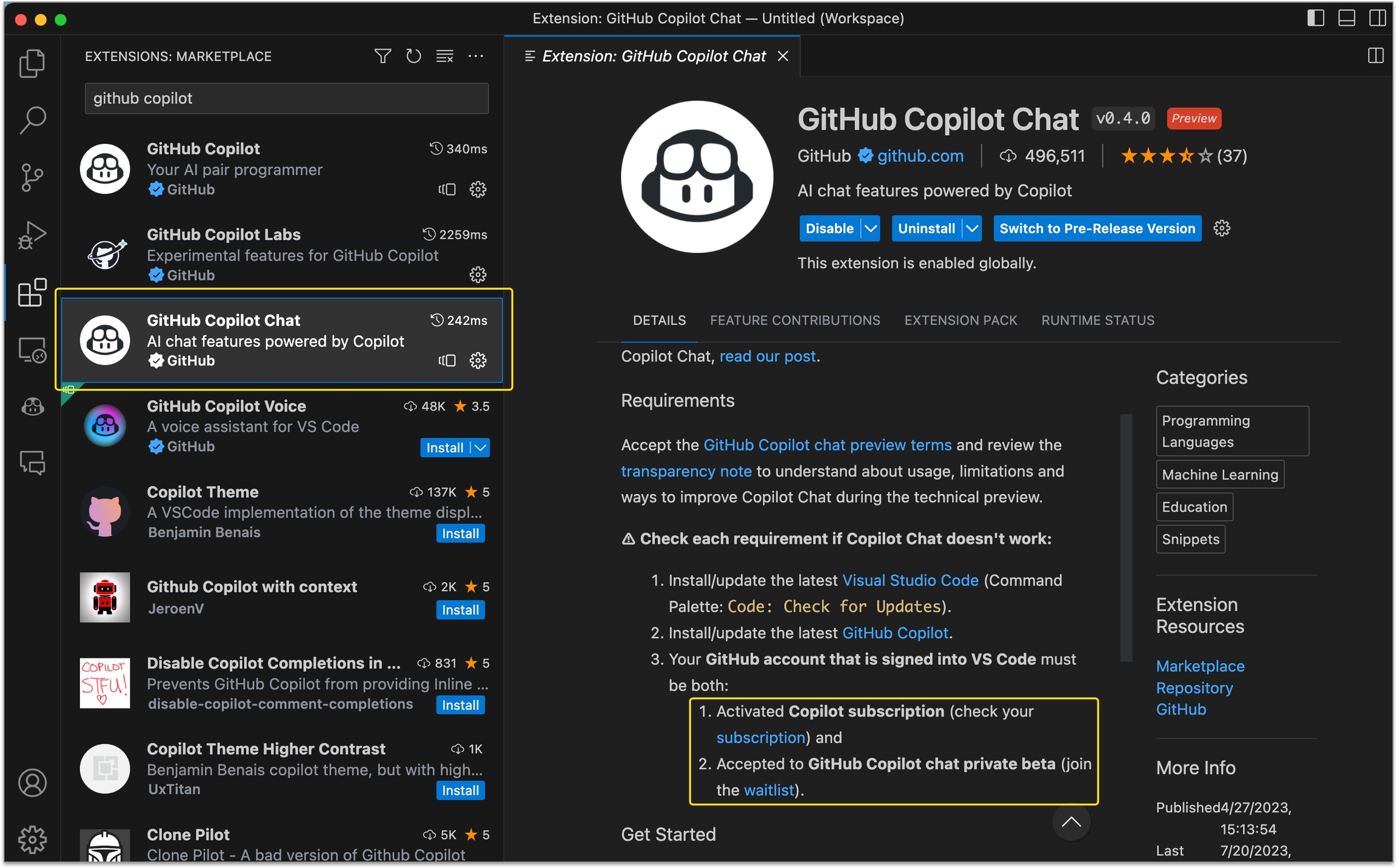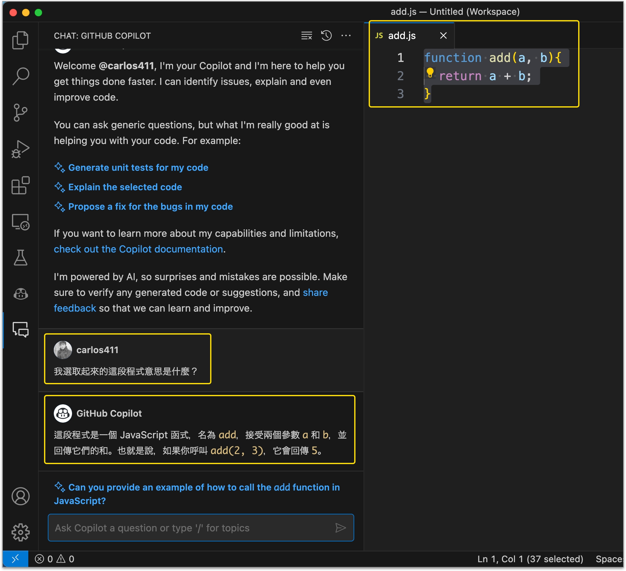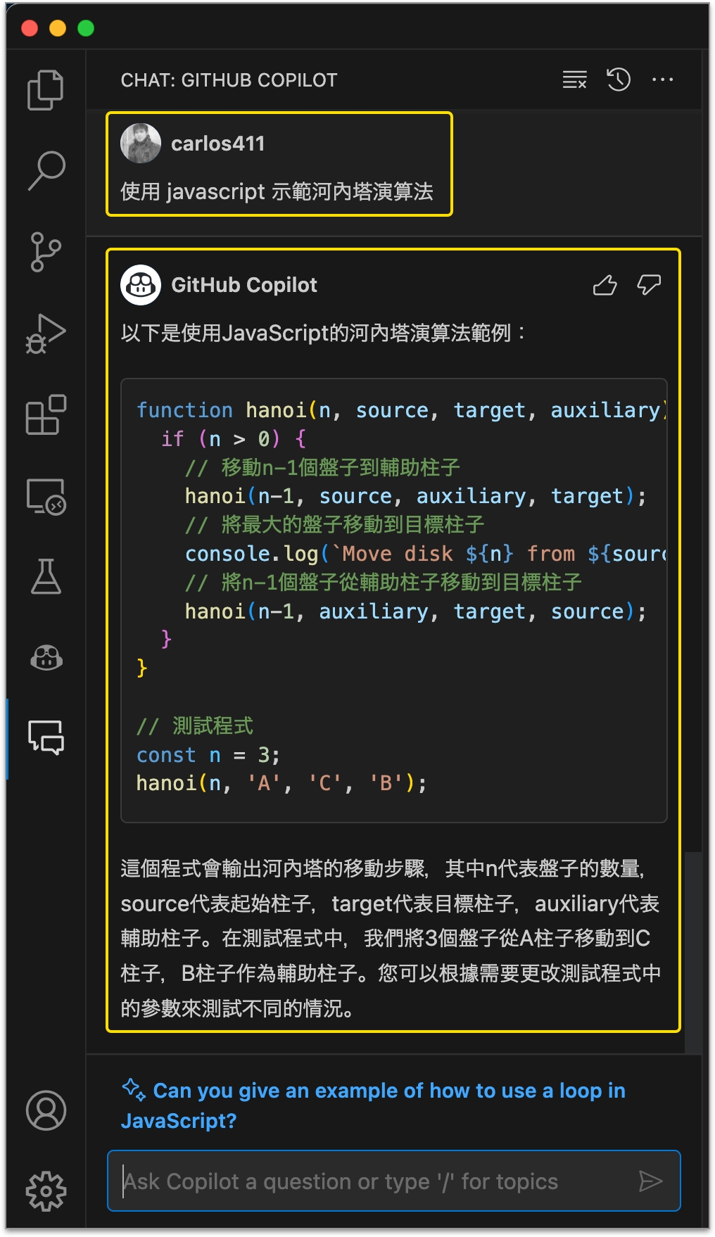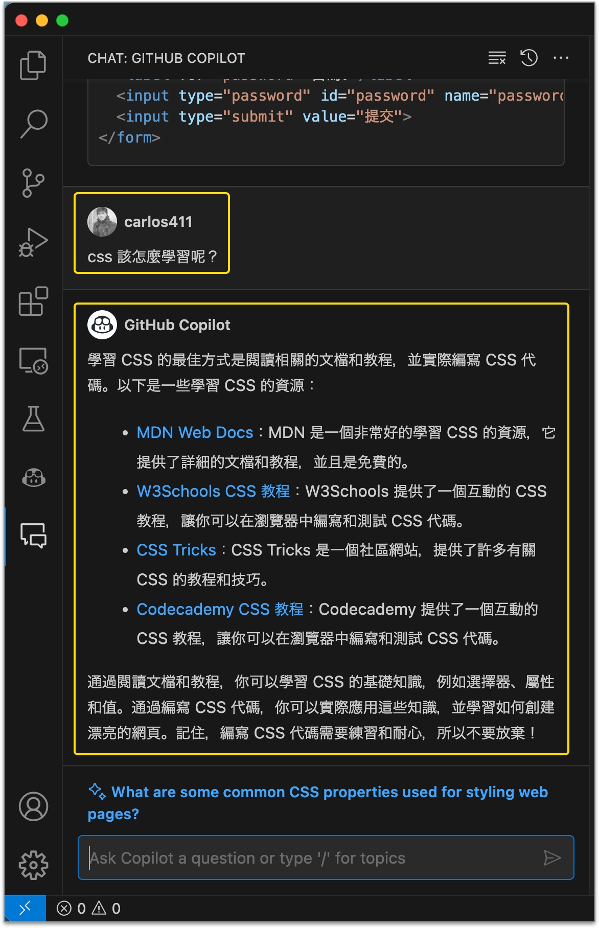 然後我在 VS Code 編輯器中,安裝 GitHub Copilot Chat 套件,如下圖: