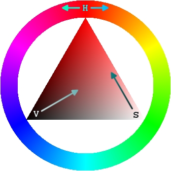 s:Saturation 飽合度。0% ~ 100%,一個顏色若飽合度愈高,愈接近純色;一個顏色若飽合度低,就愈接近灰色。