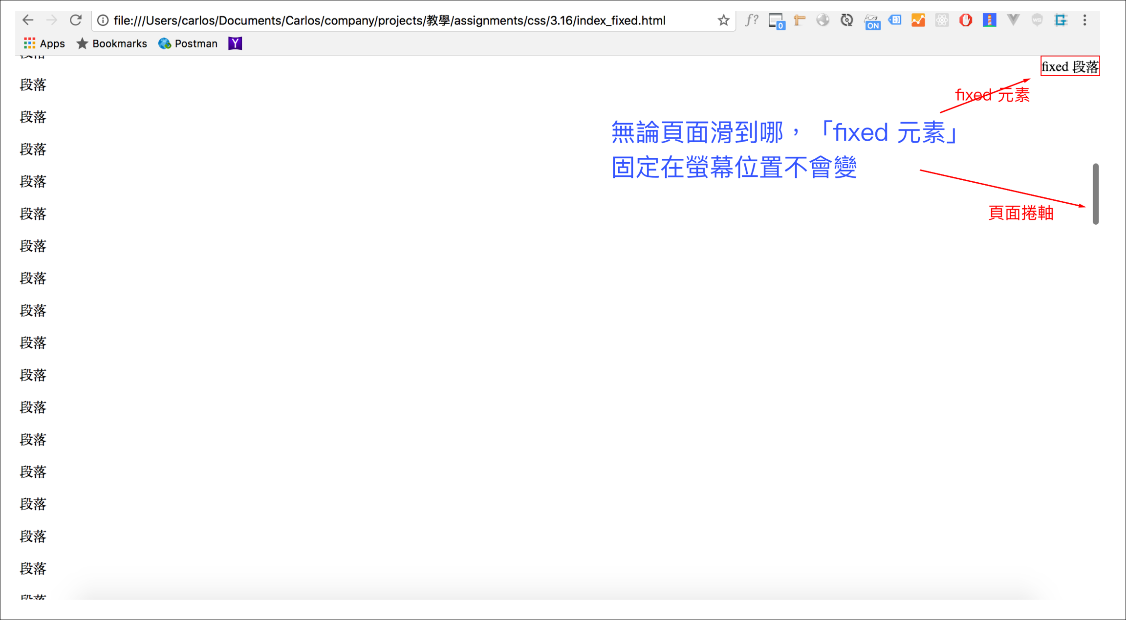 <p class="the_fixed">fixed 段落</p>