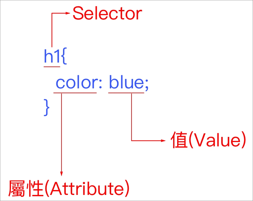 Attribute(屬性):套用的元素,要改變什麼,例如文字顏色就是 color。