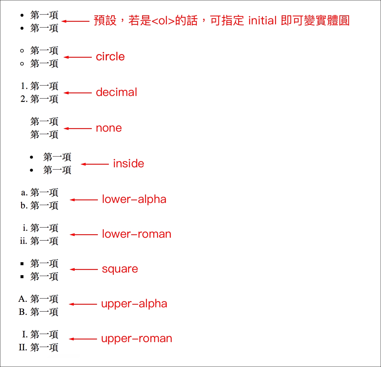 list-style:可選的常用值有 circle、decimal、none、inside、lower-alpha、lower-roman、square、lower-alpha、lower-roman。