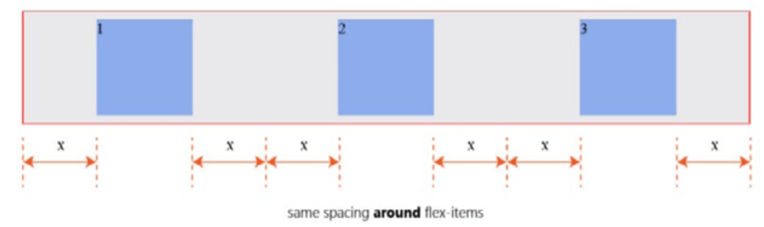 flex-start:這是預設值,全部置左。flex-end:全部置右。center:置中。space-between:各個 Flex Item 的空白間距相等。space-evenly:各個 Flex Item 的周圍間距相等。space-around:各個 Flex Item 的左右空白間距相等,如下圖: