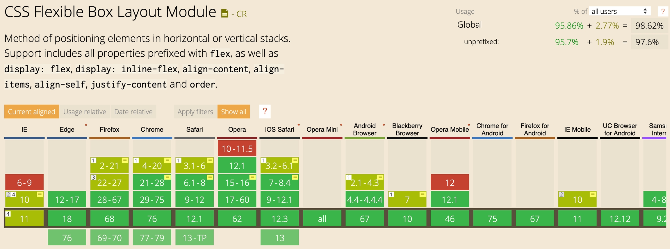 Flexbox 排版模式是 CSS3 才有的東西,所有如果要使用,請留意它的支援度。來看一下 Flexbox 的支援度。