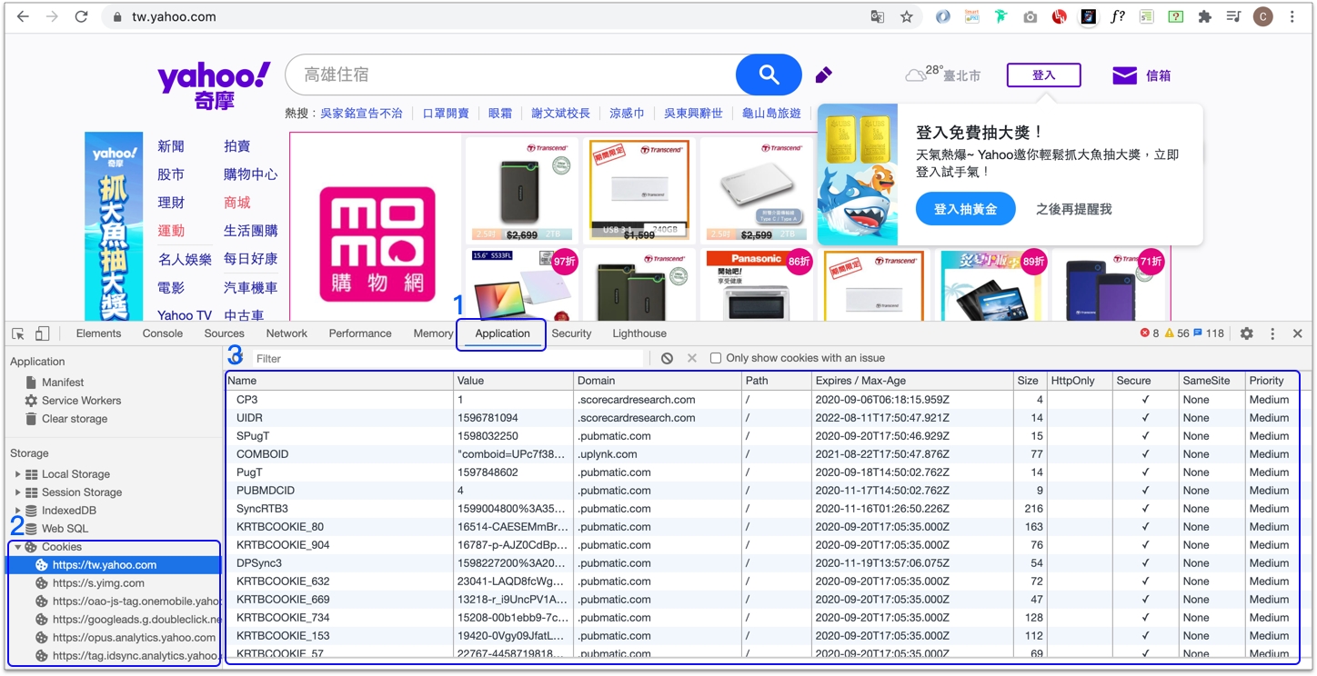 以下程式建立了兩個 cookie,名稱(Name)叫做「food_id」,值(Value)是「abc」;另一個是名稱叫做「ad_code」,值是「year2020」:(執行完以下程式後,找出在哪裡看得到。)